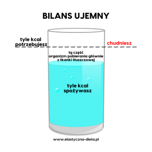 Ujemny bilans energetyczny ma miejsce, kiedy spożycie kilokalorii w ciągu doby jest mniejsze niż zapotrzebowanie kaloryczne. Organizm, który otrzymuję mniej energii z pożywienia, pobiera ją sobie z rezerw energetycznych organizmu, głównie z tkanki tłuszczowej, ale nie tylko bowiem podczas redukcji ubytek z tkanki tłuszczowej odpowiada za 60-80 % redukcji masy ciała [4].