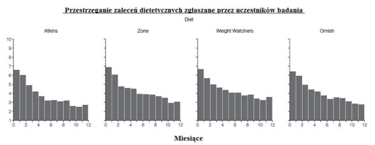 Spójrz na grafikę, im dłużej trwało badanie, tym trudniej było uczestnikom trzymać się założeń diety, a ich motywacja spadała.